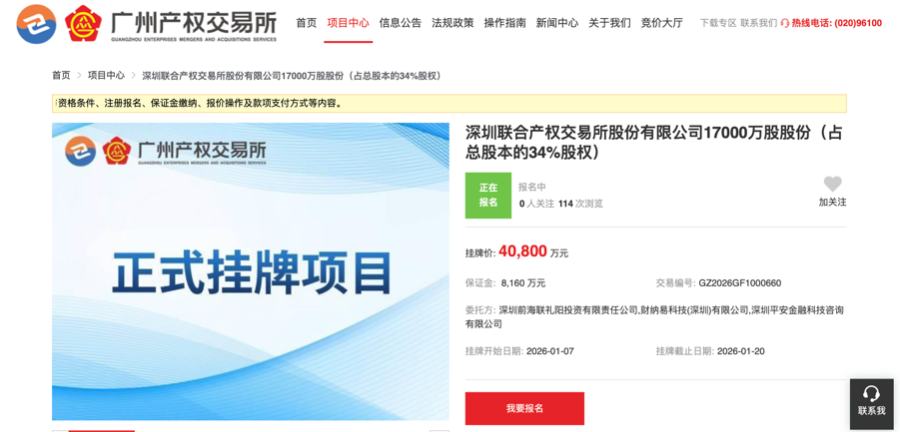 1月14日,21世纪经济报道记者注意到,深圳联合产权交易所股份有限公司(简称“深圳联交所”)1.7亿股股份(占总股本的34%股权)项目在广州产权交易所公开挂牌转让,挂牌价为4.08亿元。