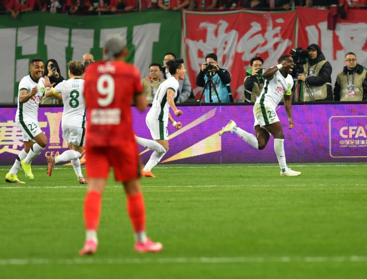 12月6日,北京国安队球员法比奥(右一)在比赛中庆祝进球。新华社记者 李嘉南 摄