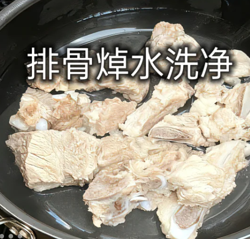 4:猪骨别急着下锅,冷水下锅焯水这步很关键,泡好的骨头冷水下锅,加一勺料酒、几片姜,水沸后煮三分钟,这时候会浮起很多血沫,用漏勺撇干净,捞出的骨头用温水冲洗,千万别用冷水,会让肉质紧实,里面的血水出不来。